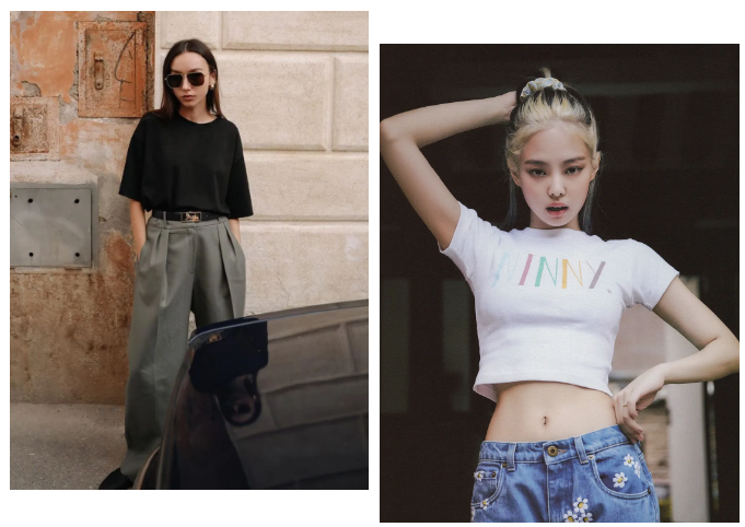 从款式上看,宽松oversize版和BM风的合身短款,是现在T恤的主旋律。风格嘛,一个随意休闲,一个热辣甜酷。虽然适合的体型不同,但都很日常好搭。