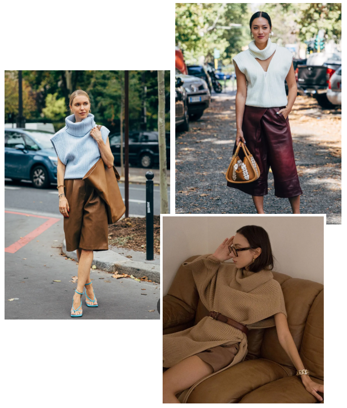 除此之外,今年很受欢迎的还有短袖款和马甲款毛衣。短袖针织衫在早秋季节其实还挺实穿的,比T恤暖和,又不会过于闷热,在风格上也更优雅。