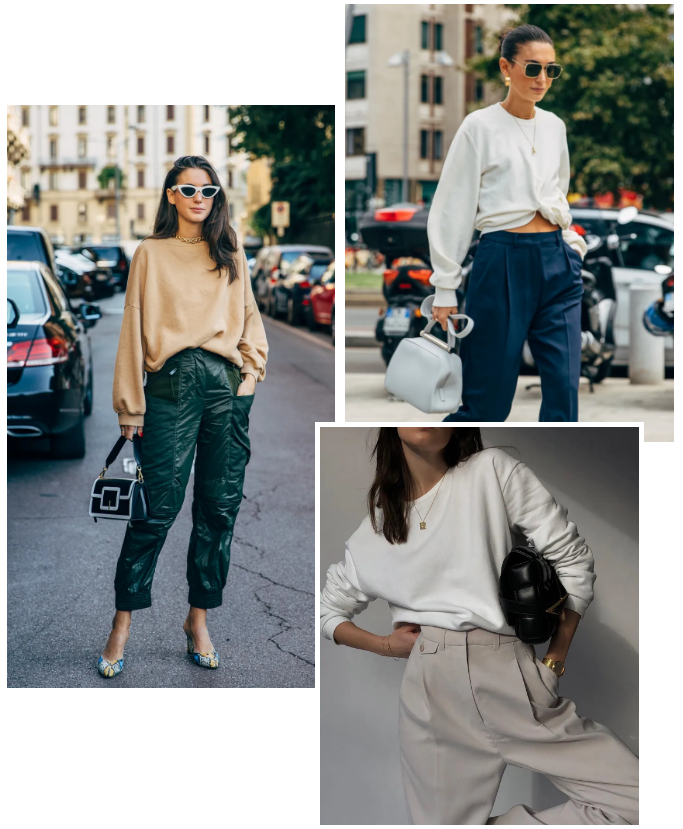 相较之下,圆领卫衣会更适合通勤。尤其是纯色的、无明显运动装饰的款式,搭上西装裤、高跟鞋,穿进职场也不会奇怪。