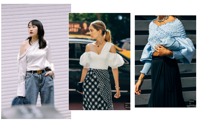 露肩的方式也有很多,斜肩、斜吊带甚至裹身…都可以达到这个效果。尤其是露肩+有袖子的款式真的很适合手臂胖,但肩膀线条不错的女生,非常显瘦。