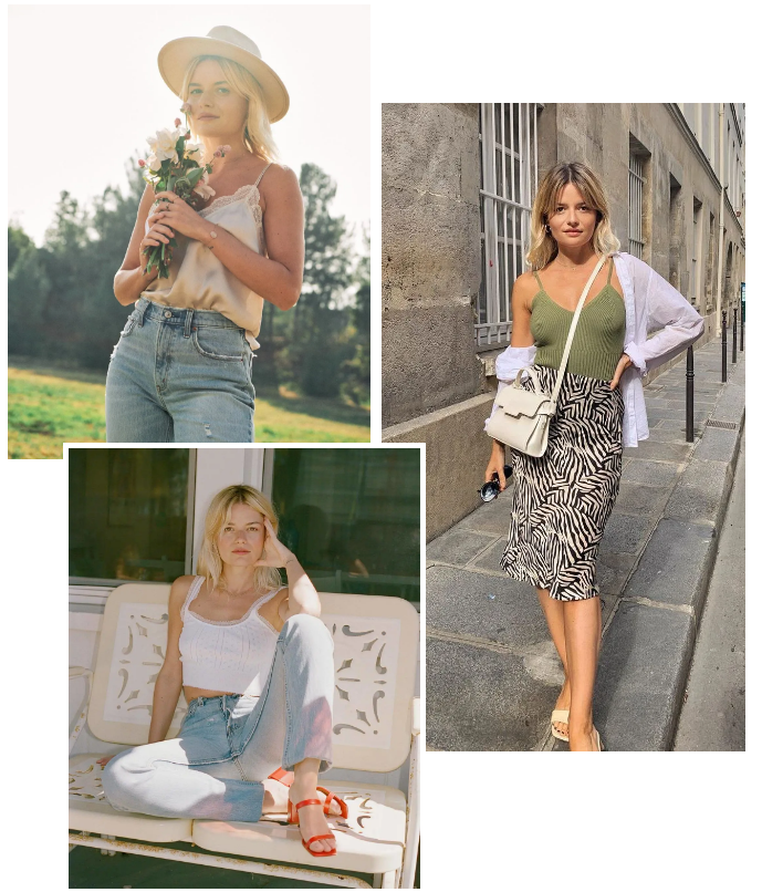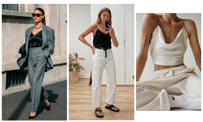 正是因为吊带衫女性特征鲜明,它可以用于混搭各种你觉得太休闲、太man味的单品。比如大西装、运动裤、牛仔裤、丑拖鞋…