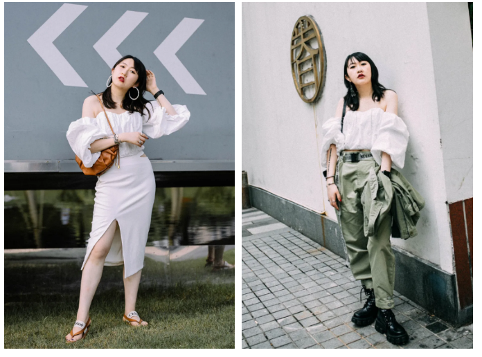 喜欢女人味的女生还可以尝试一下各种变着法子露肩的上衣。姜女士有一件RE'VAN的鱼骨上衣,今年夏天穿了很多回。搭裙子和工装裤完全是两种风格: