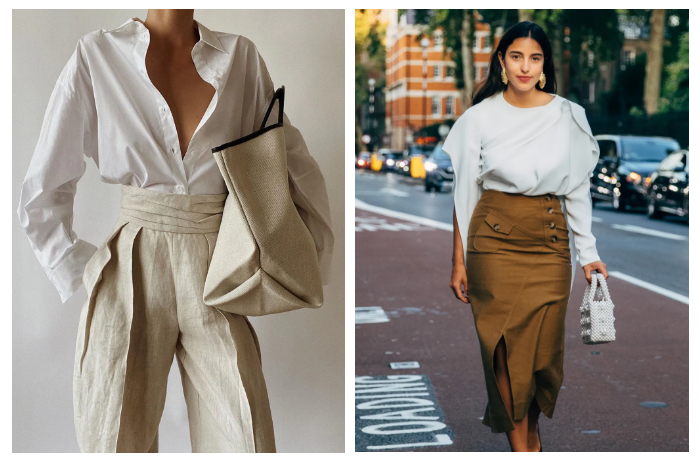 选衬衫的两要素,除了款式就是面料。什么棉质、真丝、雪纺…,面料种类太多,说细了你们也记不住。所以咱们就简化,衬衫面料就两大类:挺括or垂顺!