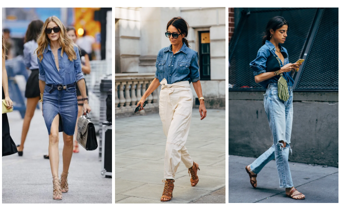 跟飘带衬衫的女人味站对立的就是休闲的牛仔衬衫了。虽然不适合那些对着装要求严格的职场,但不能忽视它在街头风单品中的地位。