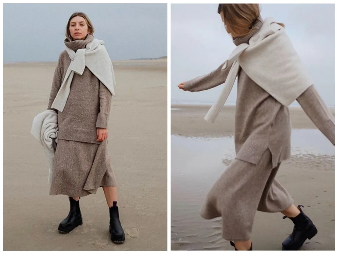 英伦博主Brittany也pick过。燕麦色针织套裙搭配切尔西靴,再披上一件米色披肩,简直是秋日穿搭范本好嘛!