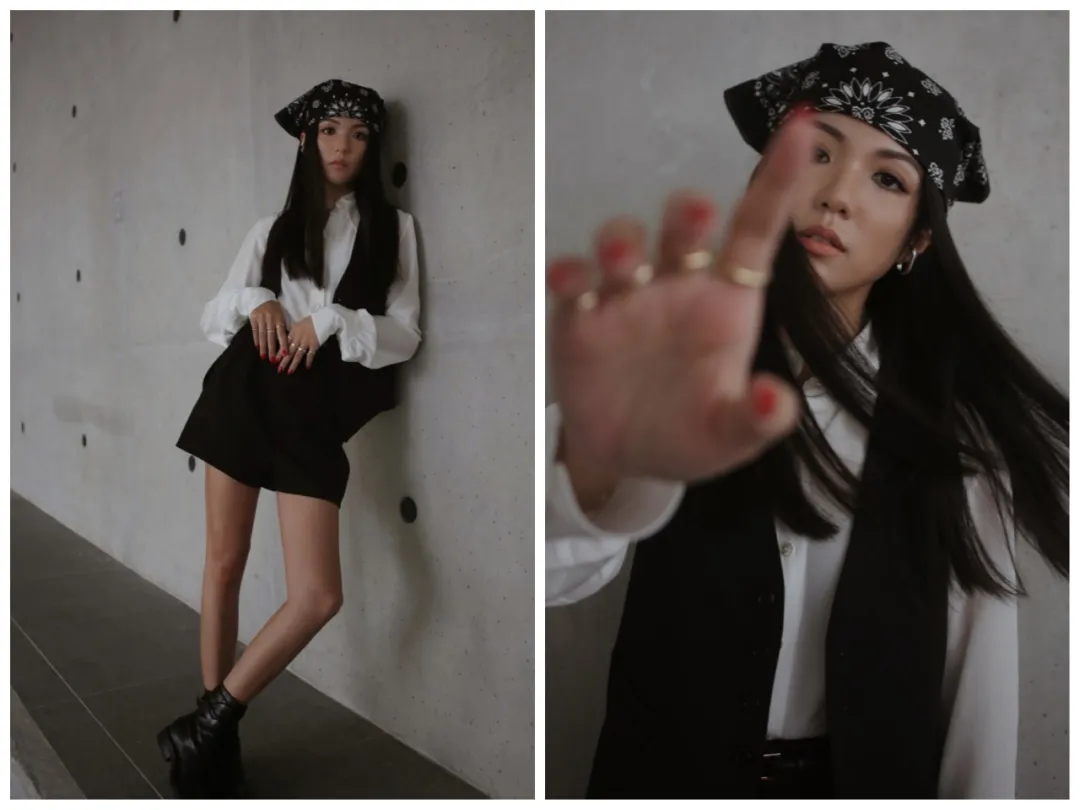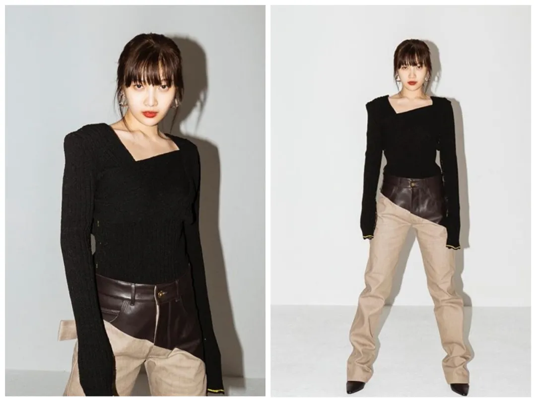 红贝贝Joy也穿过一套,即使只拼接了一小块皮料,整体气场也强大许多,适合亚洲女生借鉴。