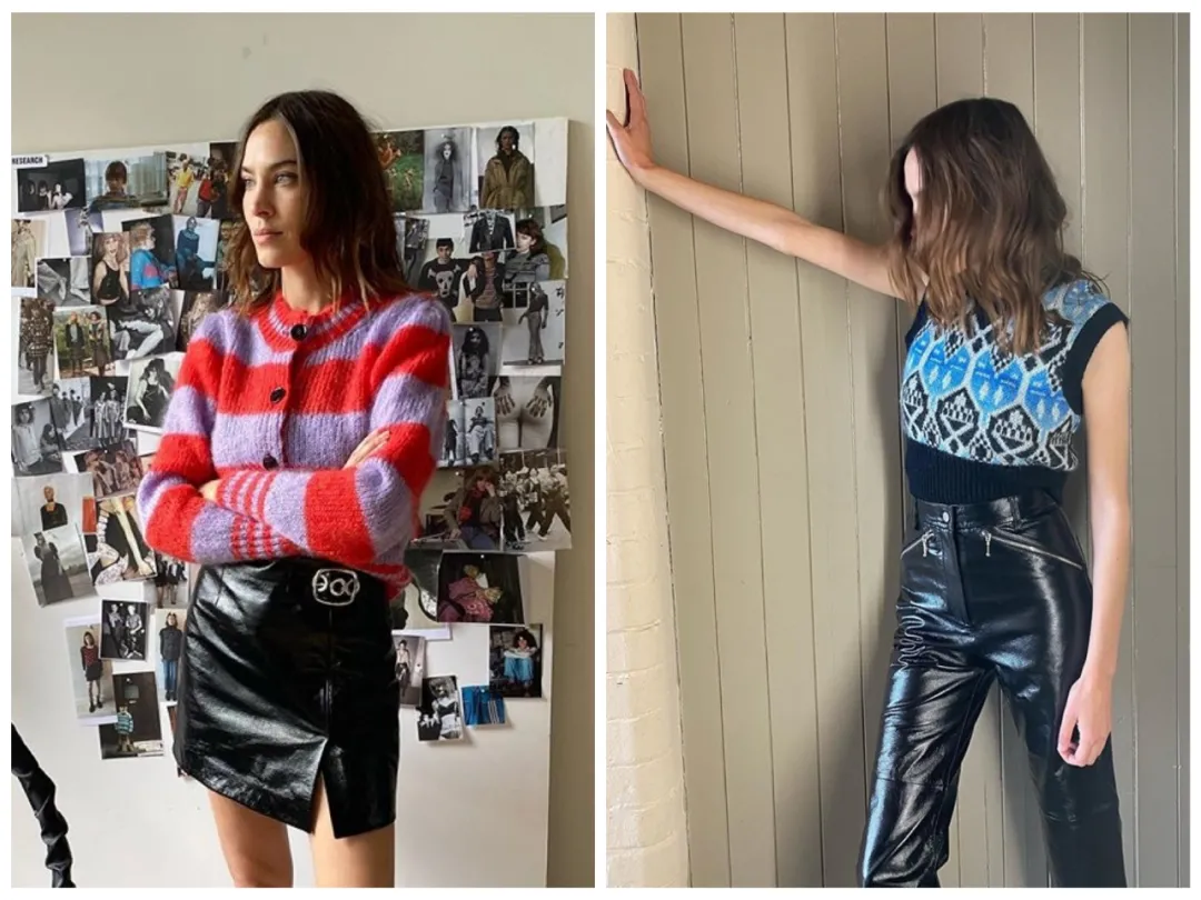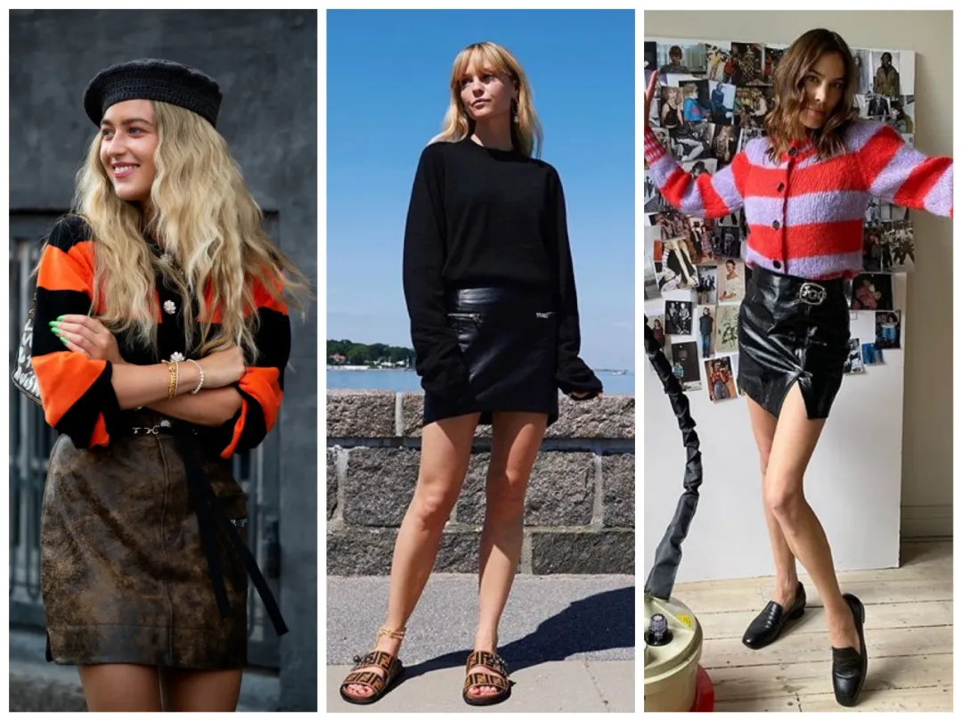 而对于叛逆的女孩,不妨学Emili Sindlev和钟小姐,用皮质短裙搭活力满满的彩色条纹开衫吧!