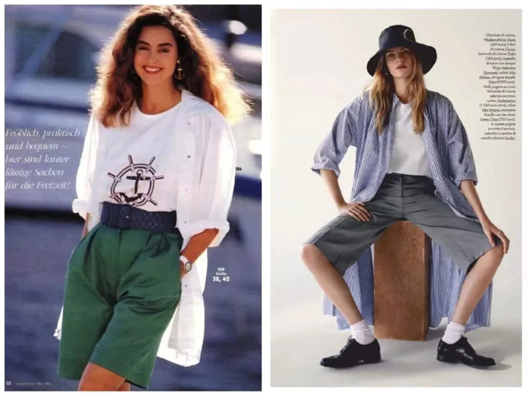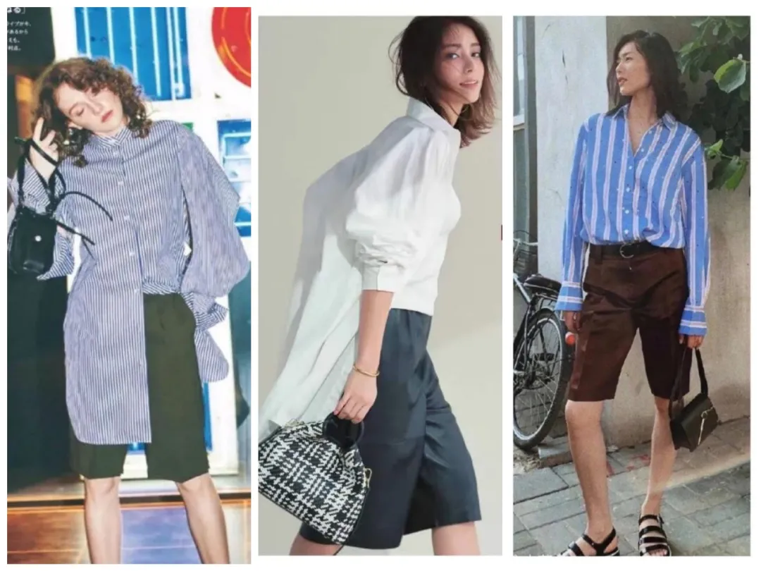 想要休闲洒脱一点,学日杂和从前《ELLE》模特的穿法,内搭T恤、短裤,把衬衫当外套就好~如此一来,夏装还能再利用几次。
