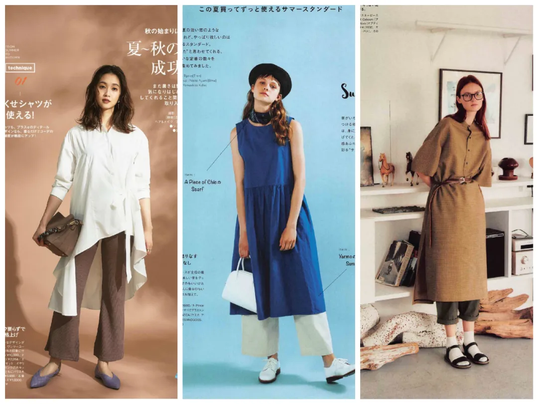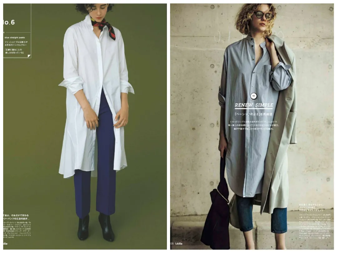 日杂超爱衬衫裙+烟管裤。同样适合轻熟女。挽起袖子、解开扣子、加点配件,就能避免像穿睡衣~