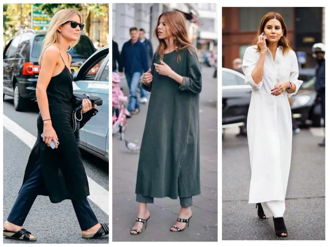 - 长裙+leggings/紧身裤/利落的直筒裤安全不容易出错。