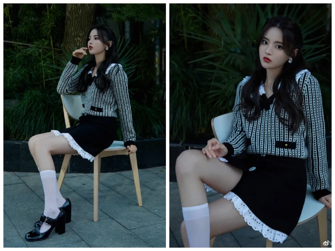 类似的look,锦鲤杨超越出席Miu Miu大秀也穿过。搭配花边短裙,显得乖巧可爱懂事,适合约会、见家长。