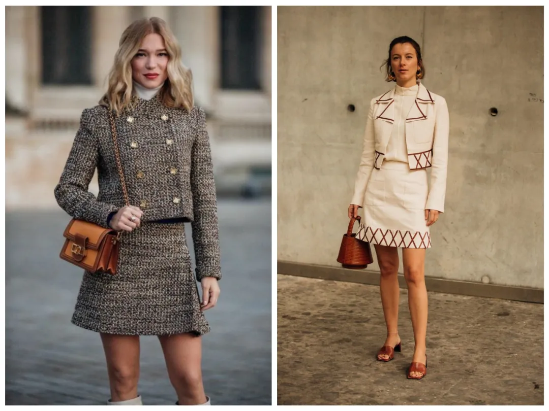 还有这种小香风套装,撑场子必备!粗花呢面料保暖又高级,光腿怕冷就配深色打底裤、长靴。