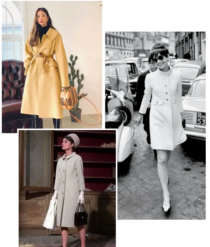 温柔型的女生还可以试试“赫本风大衣”,其实就是小A摆大衣搭配翻领或立领。A型大衣前几年一直被嫌土气,这两季随着复古风潮回归,终于翻身做主人。