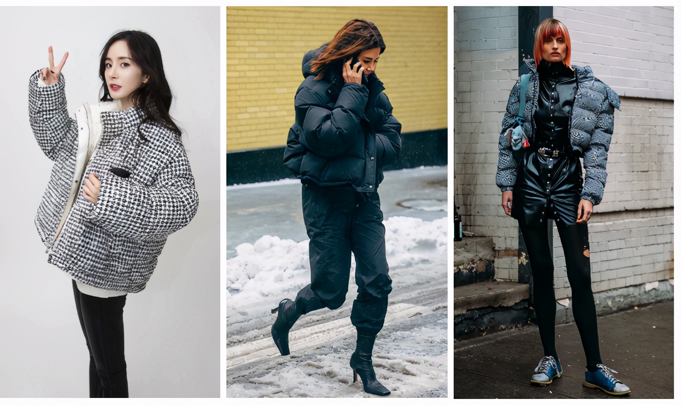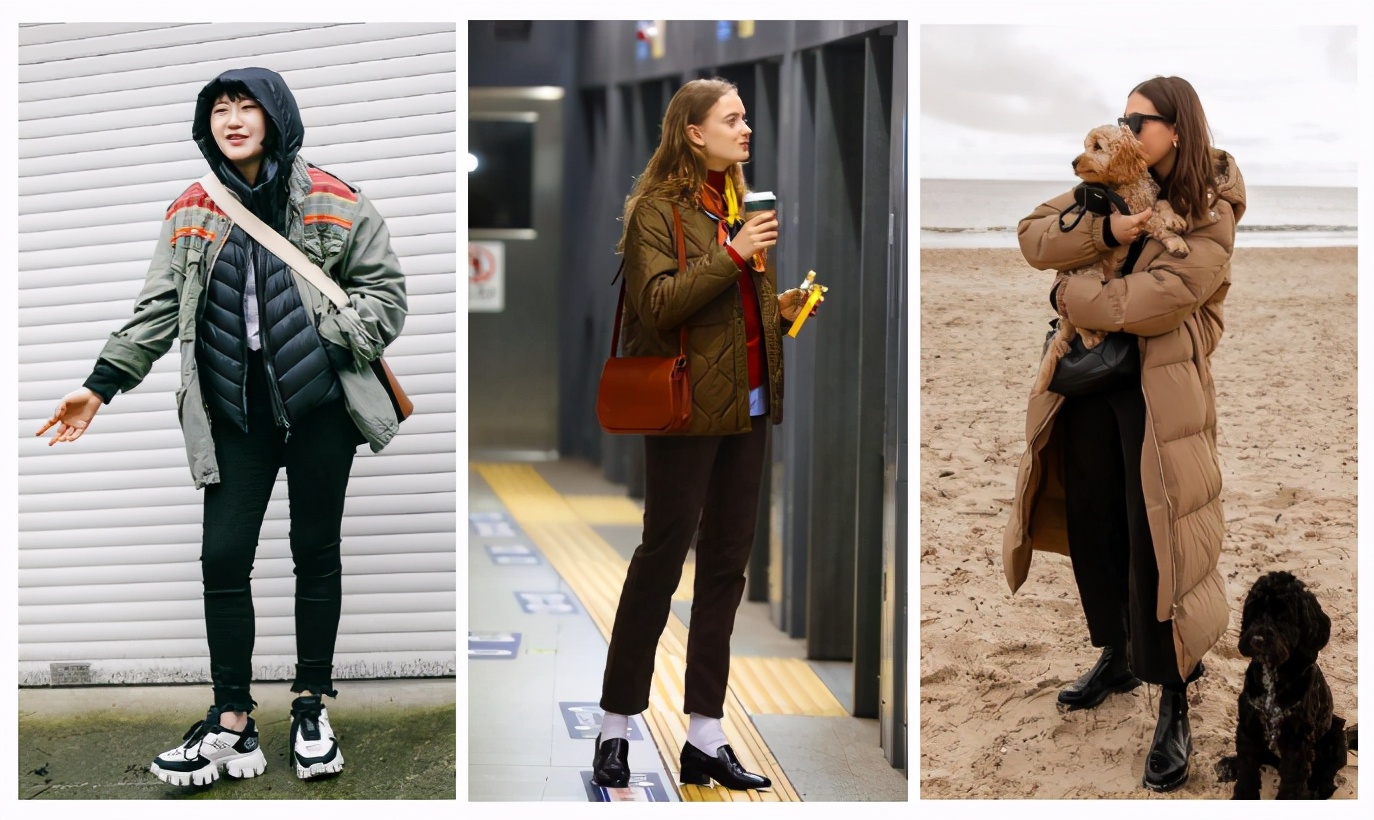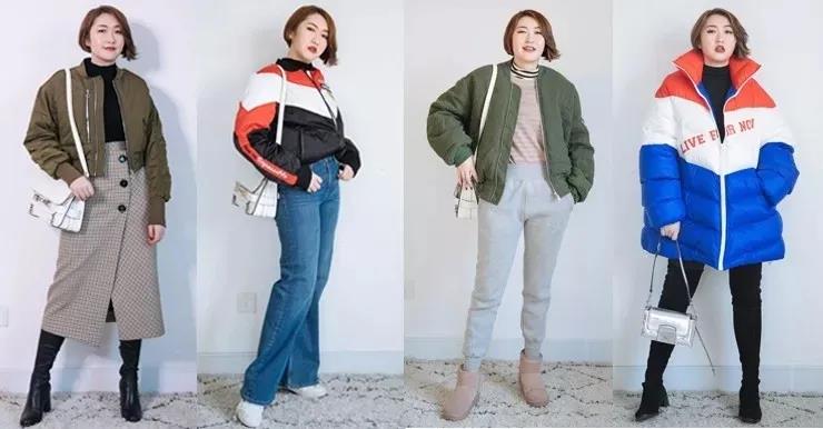 不过无论是面包服还是运动夹克,大多都是短款,会更适合下身瘦的女生。如果腿粗、屁股有肉的话,搭裤子的时候要注意裤型,或干脆搭配显瘦的裙子。