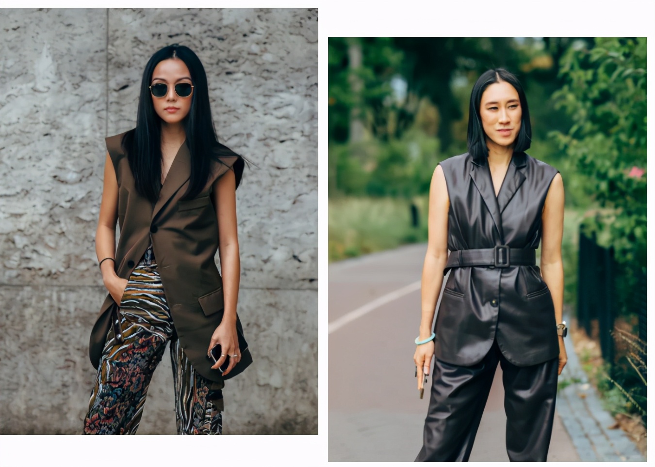 除此之外,作为西装的分支,马甲在今年也特别受宠。外套型的马甲本就蛮经典的,今年变成皮革材质,或加上大垫肩后,时髦度明显更高了。