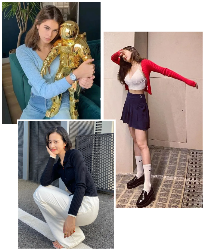 第一类是由今年夏天的BM风带火的紧身短小款开衫,这类开衫对身材包裹性很强,适合上身匀称或偏瘦的女生。