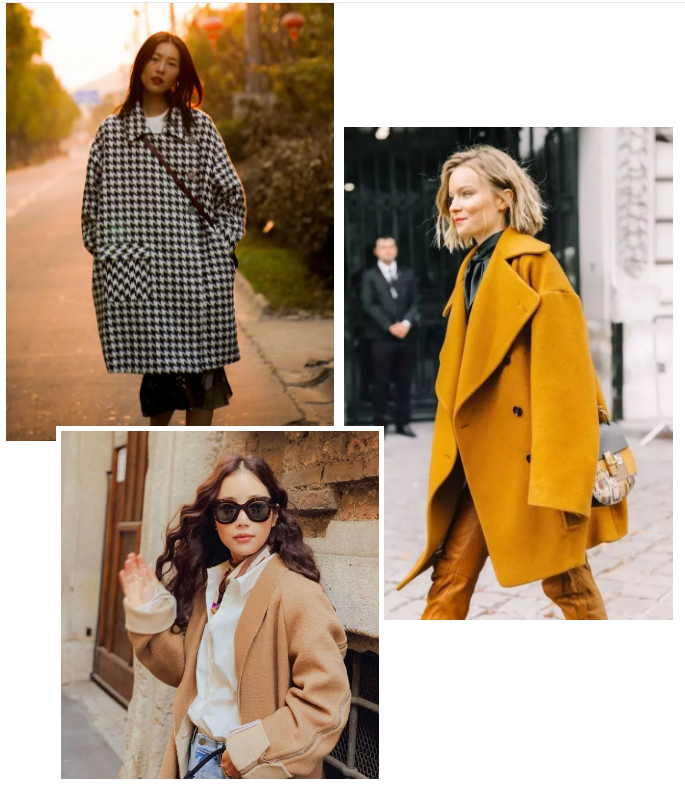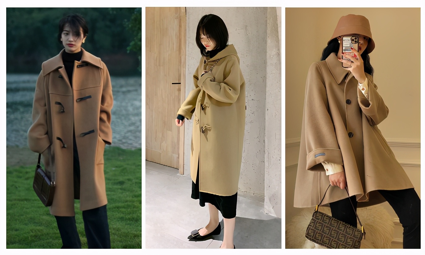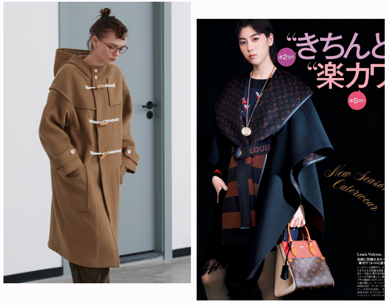 除了这些常见廓形,还有减龄又学院范的羊角扣大衣,和精致又名媛的斗篷大衣,想尝试不同风格的妹子都可以试试。