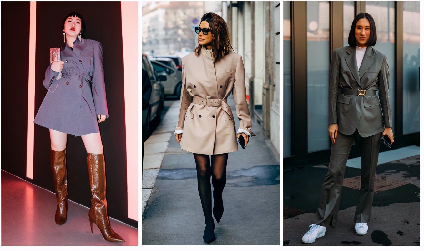 跟短西装对应的,自然就是加长款了。今年好多品牌出的长西装都是自配腰带的款式。有些更长一点的,还可以直接用来做西装裙穿,特显腰身,不挑人!