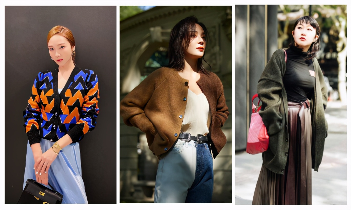 有了这俩关键词,基本啥版型都跑不偏。你看,从略合身的小开衫,到相对宽松的遮肉款,再到宽大的加长款,全都不显胖!