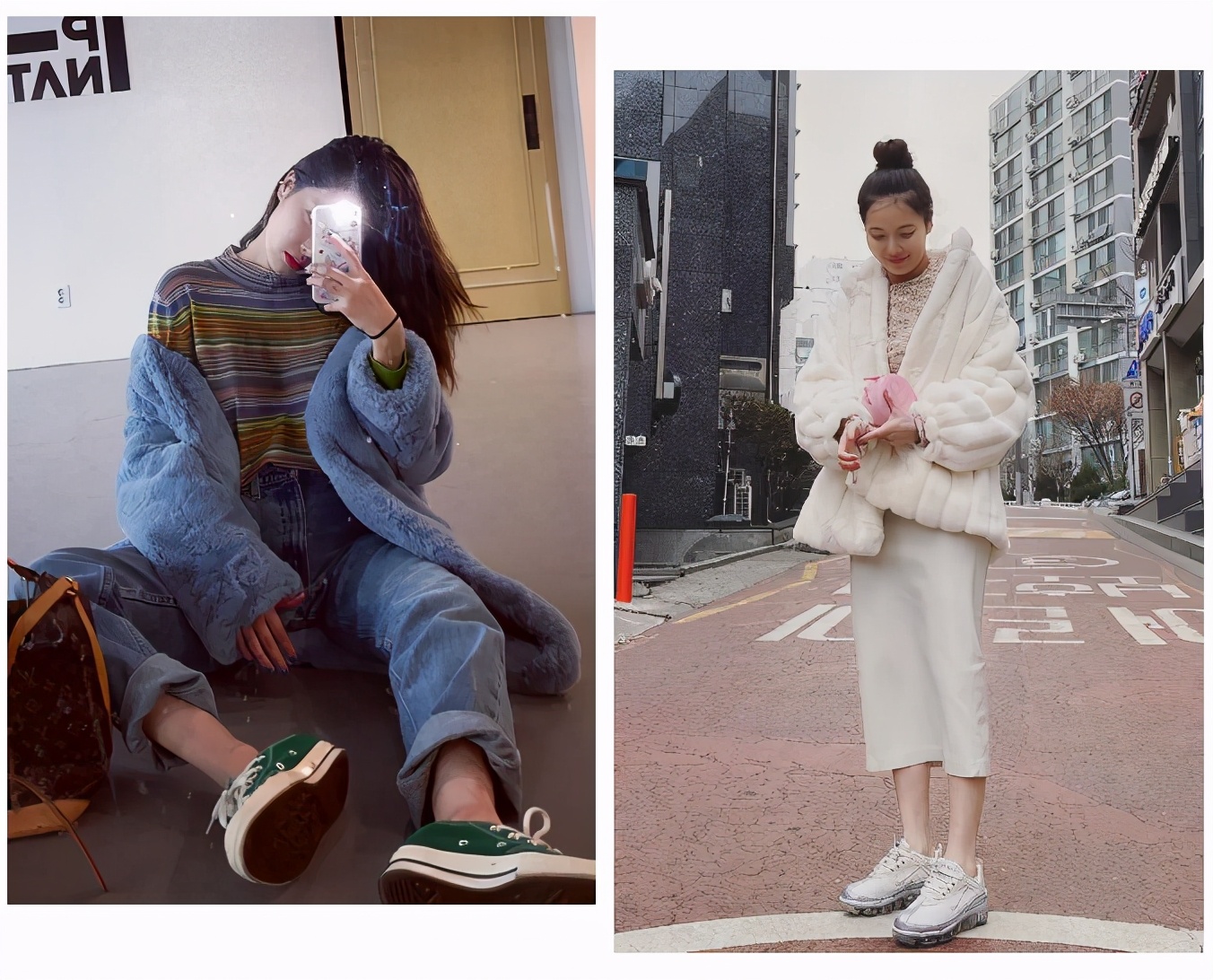 泫雅就pick过白色和蓝色的人造皮草,搭配牛仔裤、运动鞋,完全不会老气。