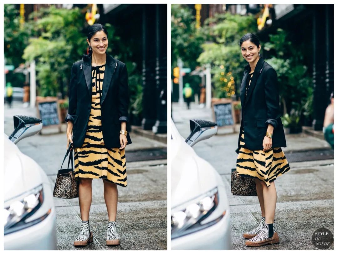 Carolina还有一套更厉害的黑色西装+虎皮连衣裙look,甚是经典!但配件不建议学习。简单的小黑靴,小黑包反而更不错。