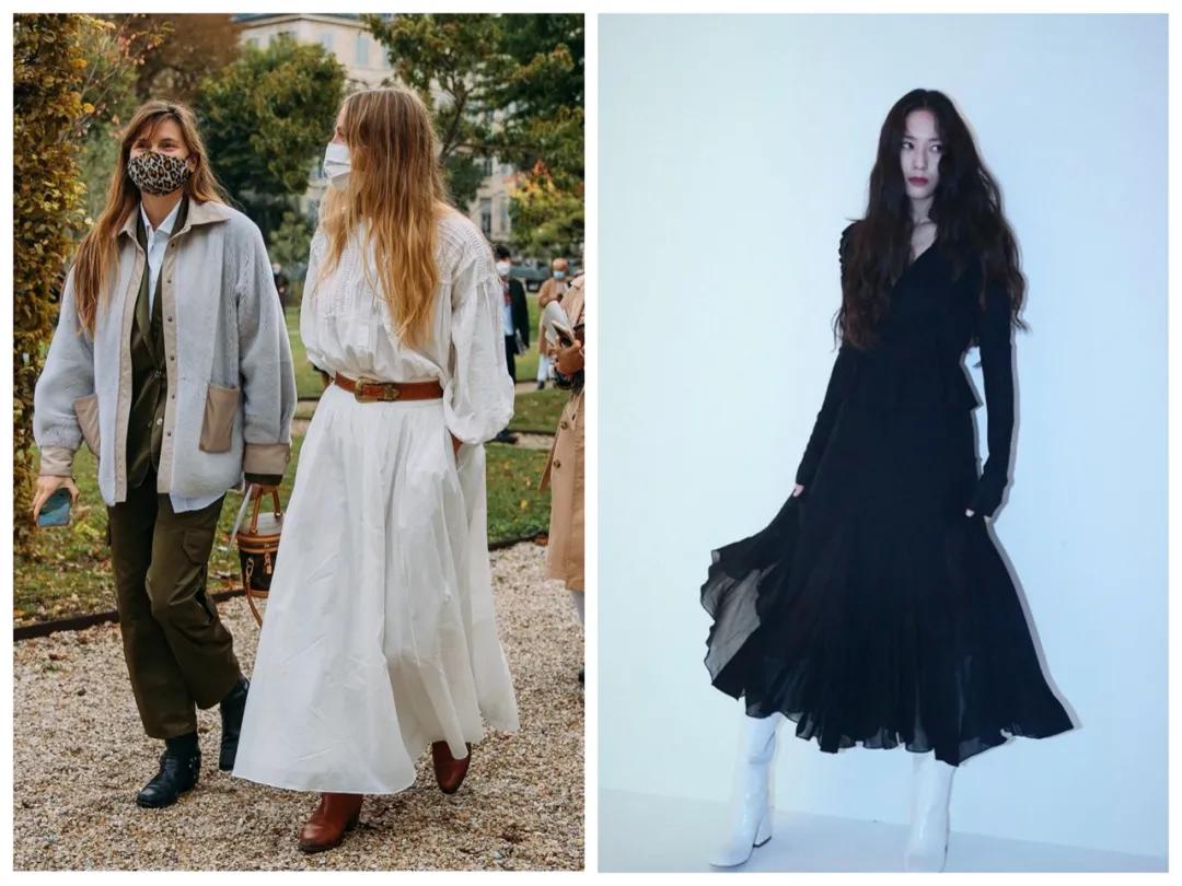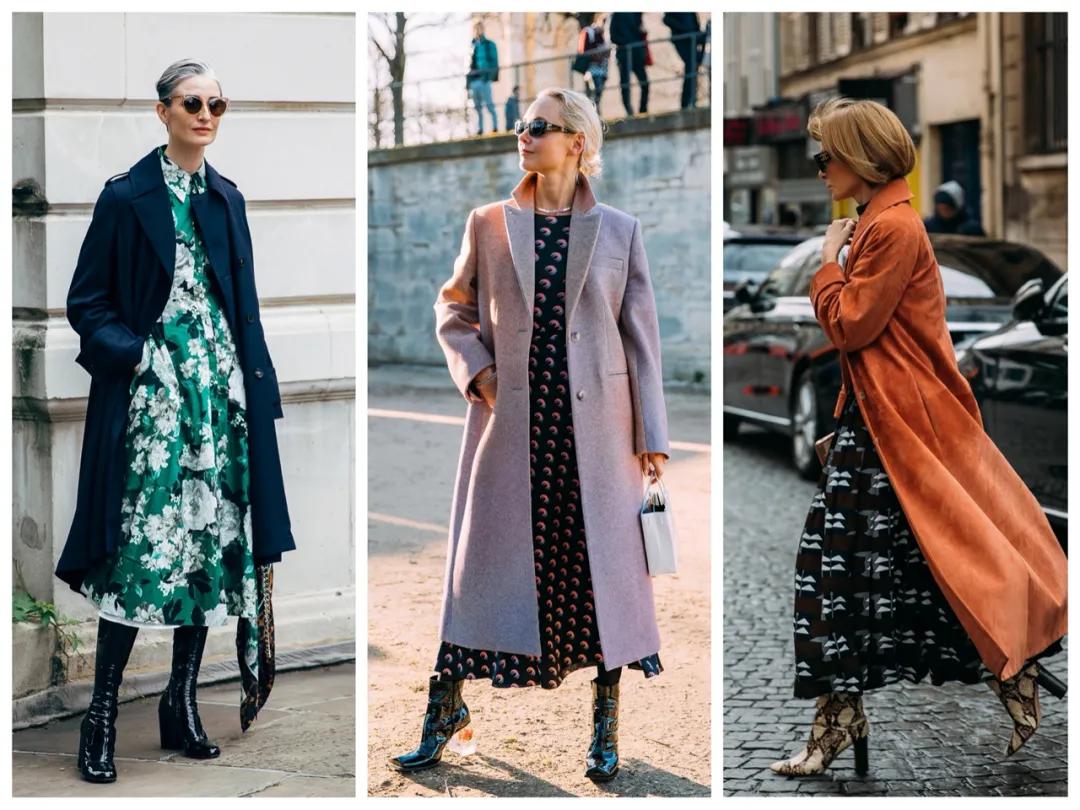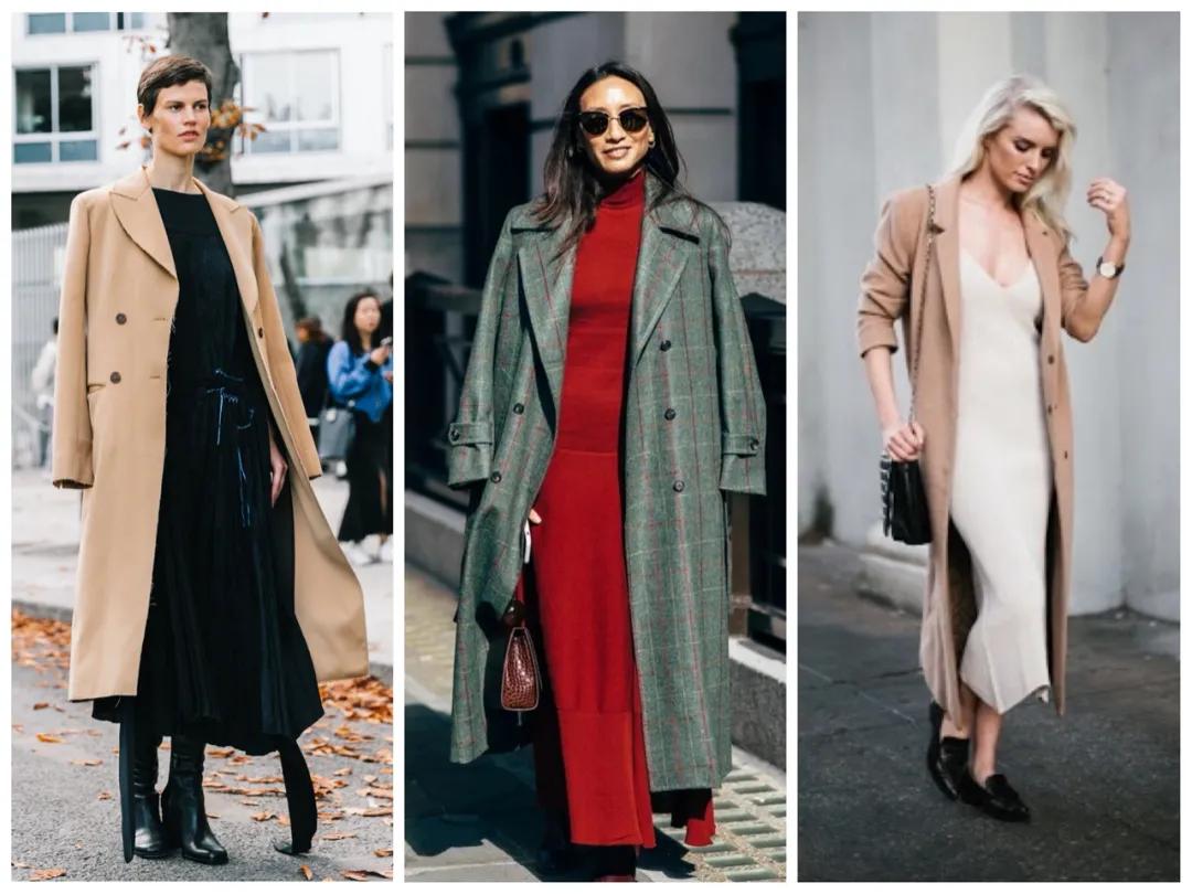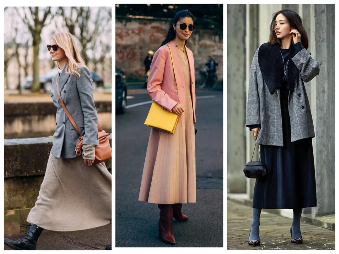 尤其是长裙+长大衣组合,内外衣摆相差3厘米左右为佳,参差摇曳,有层次感。