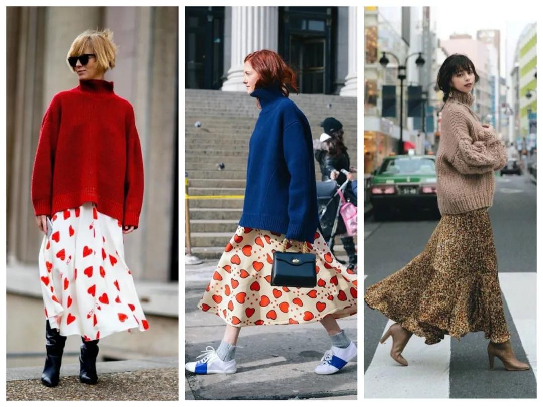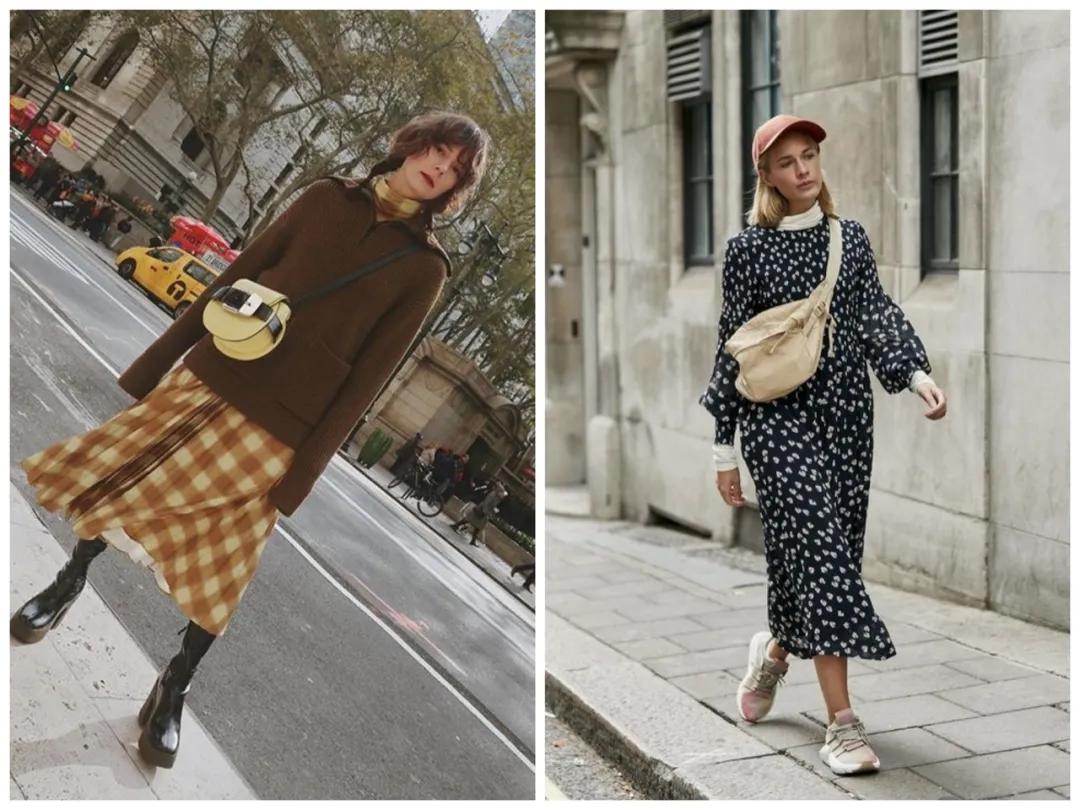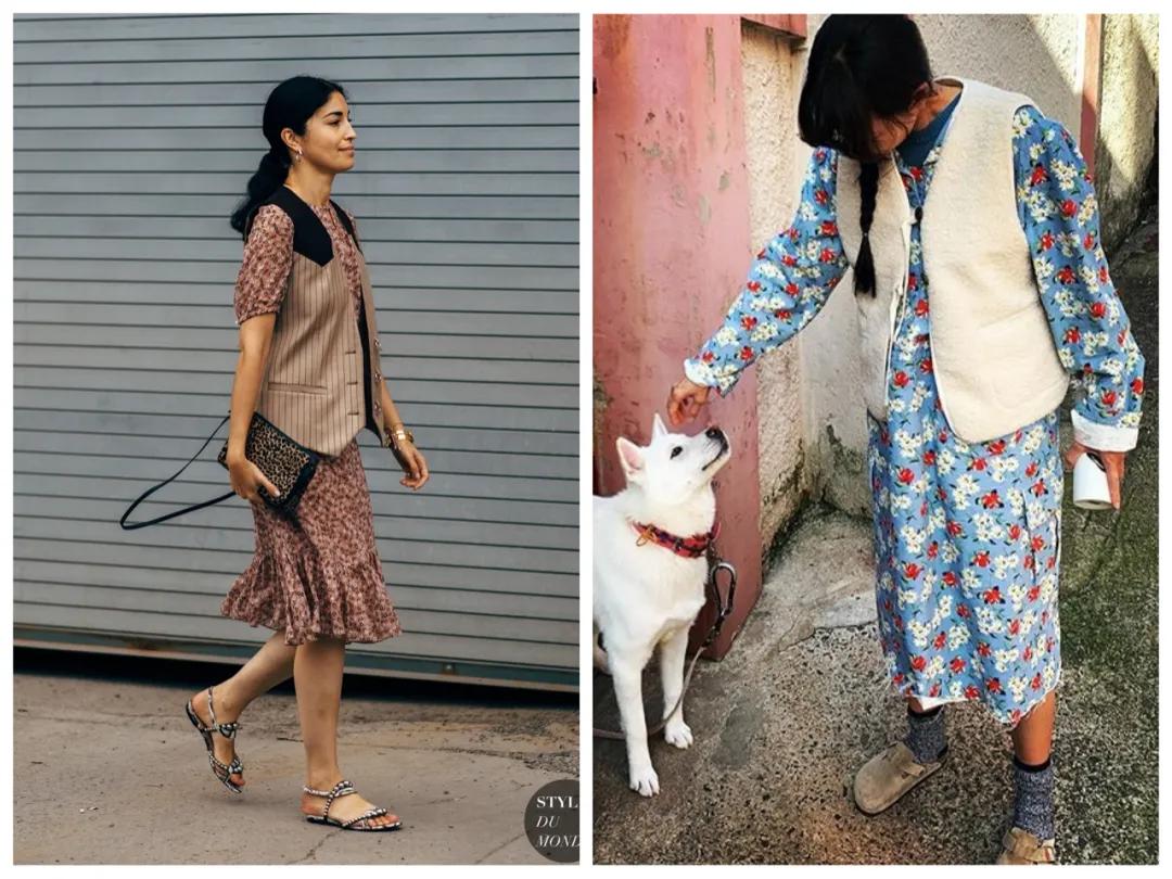 最后,还有两组特别的印花裙搭配:高领印花裙+低领针织;纯色高领+低领印花裙。