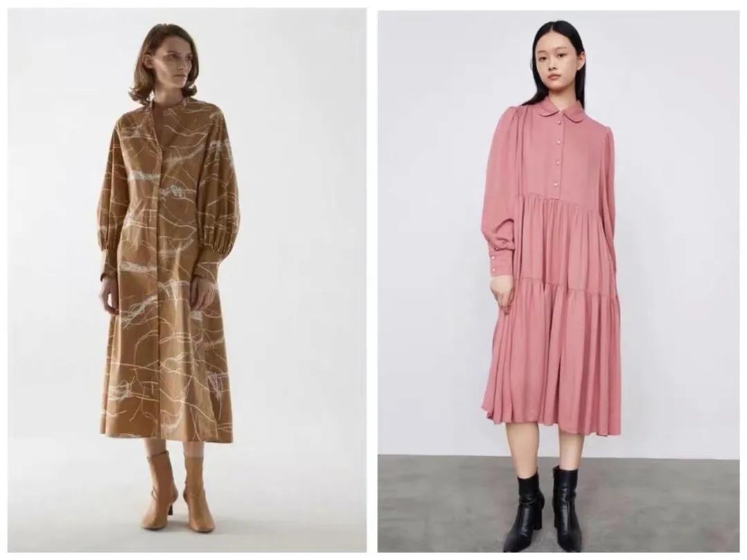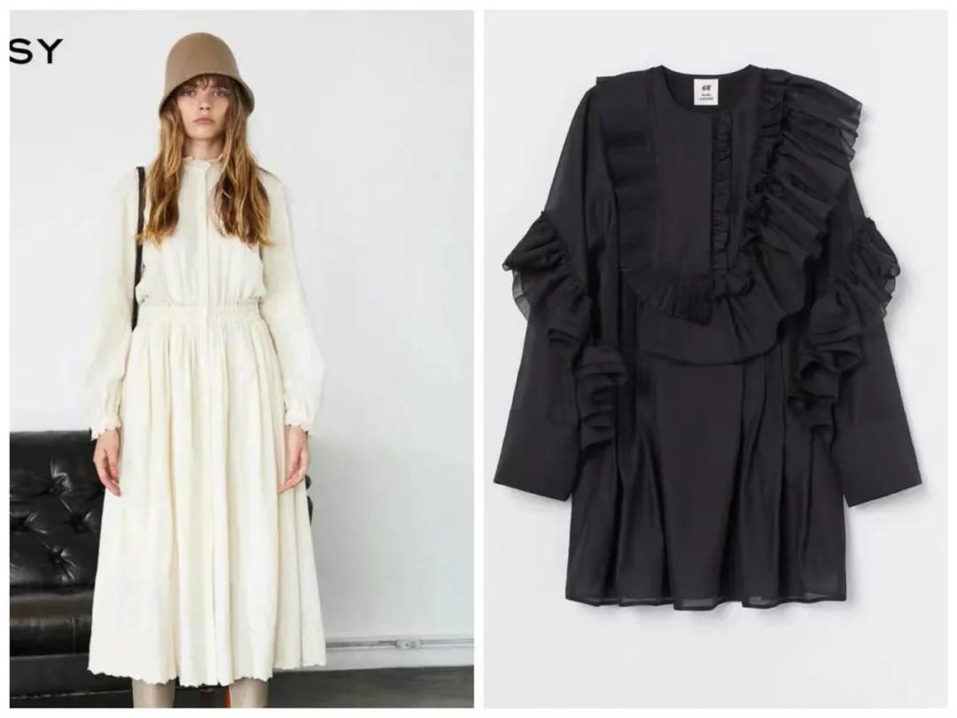 COS和UR这件,面料垂坠感不错,但又不会特别薄透。左款花色做得美丽,右款娃娃裙则充满少女感~