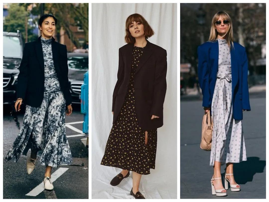 时装周里,几乎每个博主都演绎过西装+印花裙的look。
