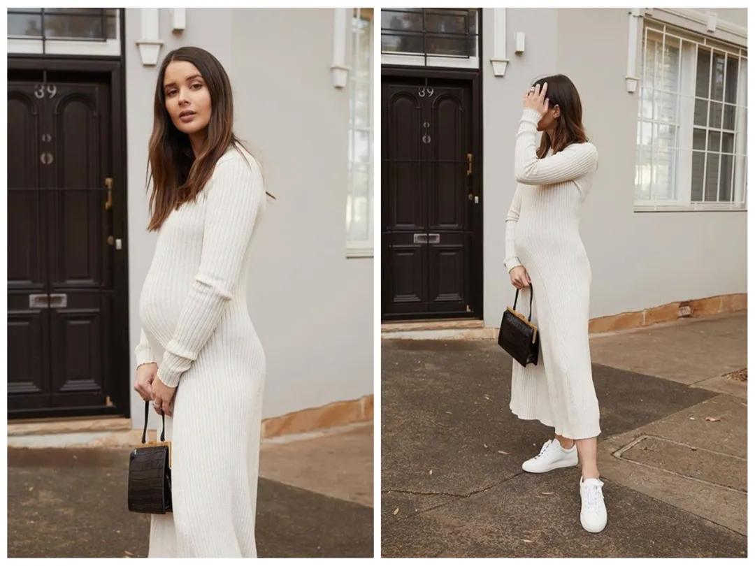 时尚博主Sarah怀孕期间就穿过一条,X型+螺纹针织,完全不显胖!!来自ANNA QUAN。