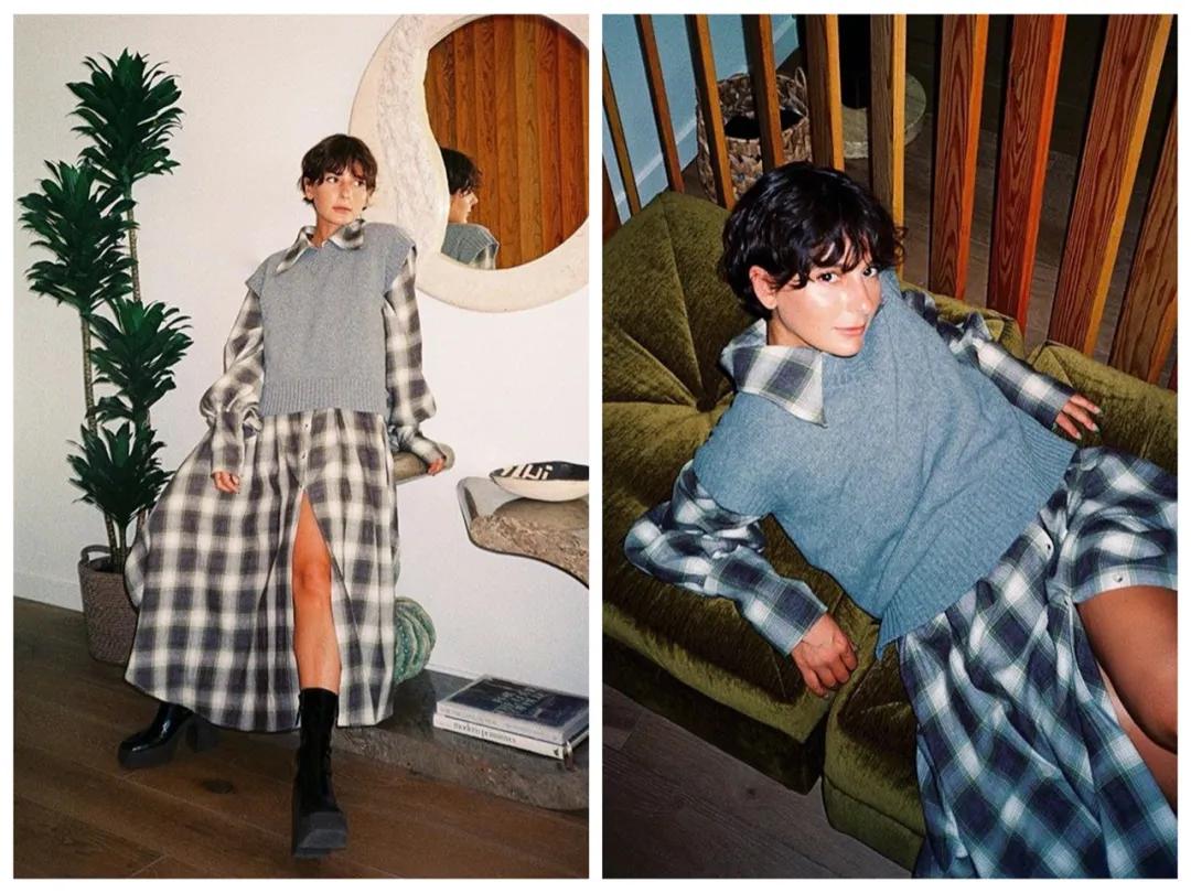 灰色针织背心与大格纹衬衫裙呼应,面料还是厚实的法兰绒,妥妥的有温度又有风度。