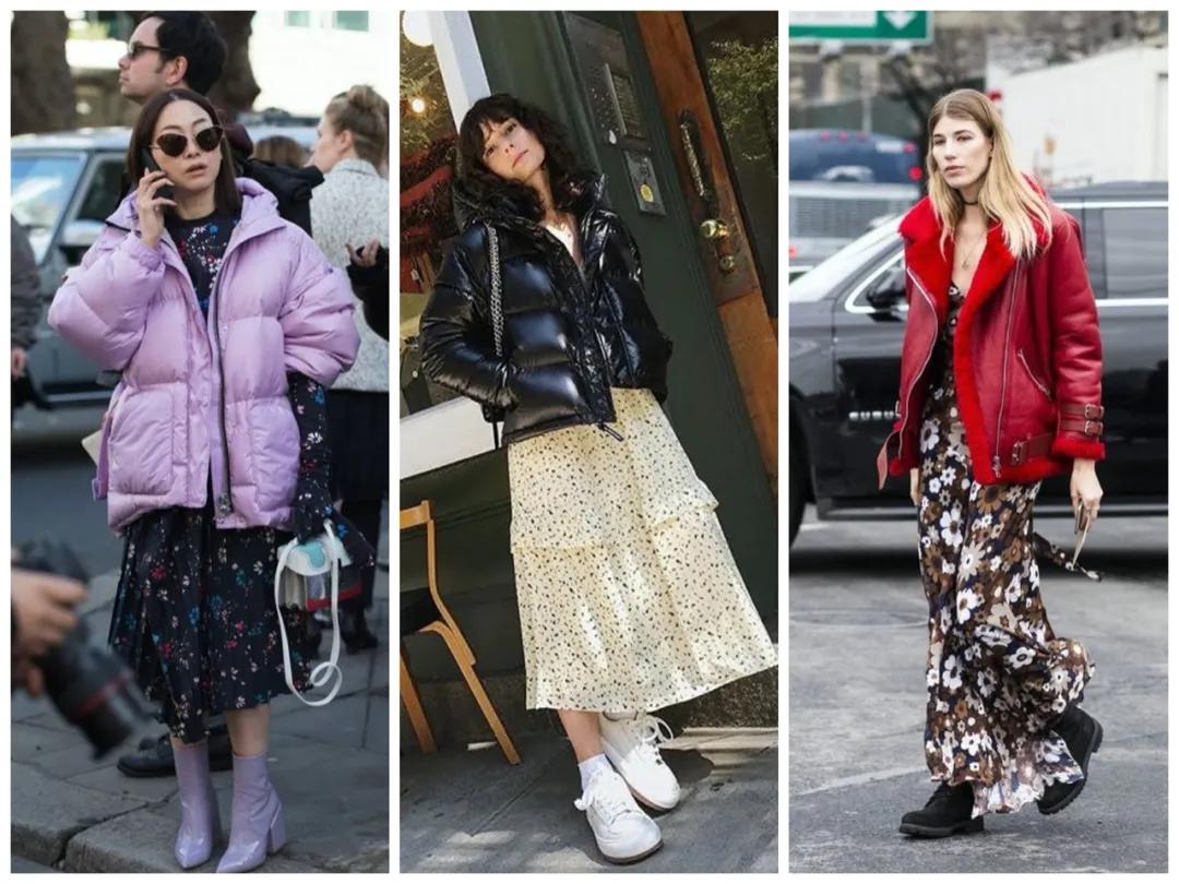 而等到深冬之后,羽绒服/羊羔毛夹克也能用来搭配印花裙哦~飘逸的裙摆能中和掉臃肿感,让你轻盈美丽。