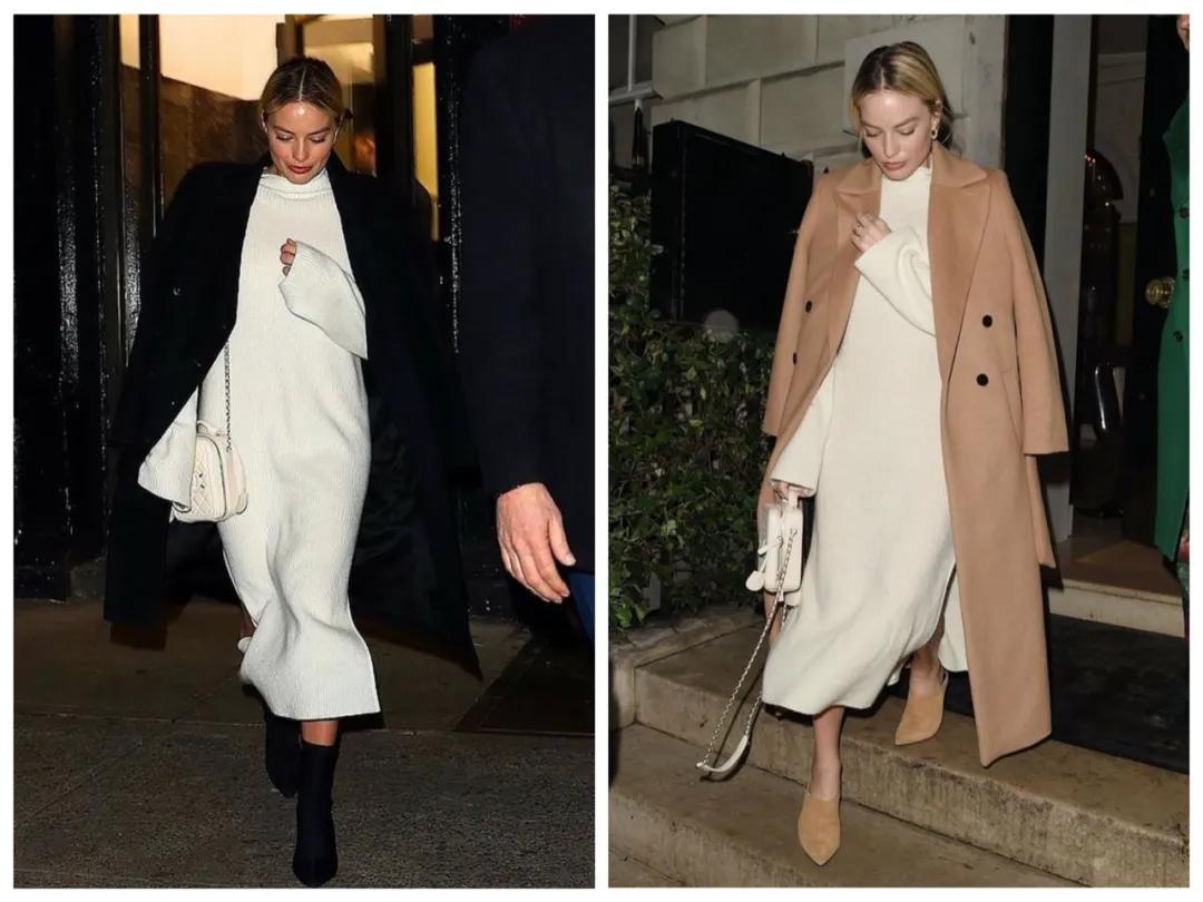 这条白色针织连衣裙,小丑女Margot Robbie穿过无数次!统统搭配利落的秋冬大衣。