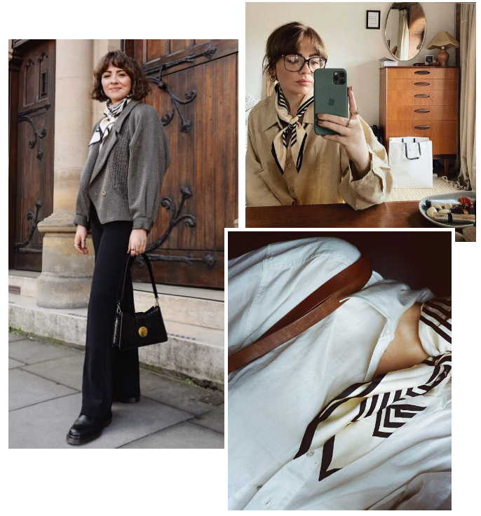 lescarf还有一条黑白条纹的,这个太百搭了,几乎任何不知道搭什么丝巾的look,Alice都会用上它。