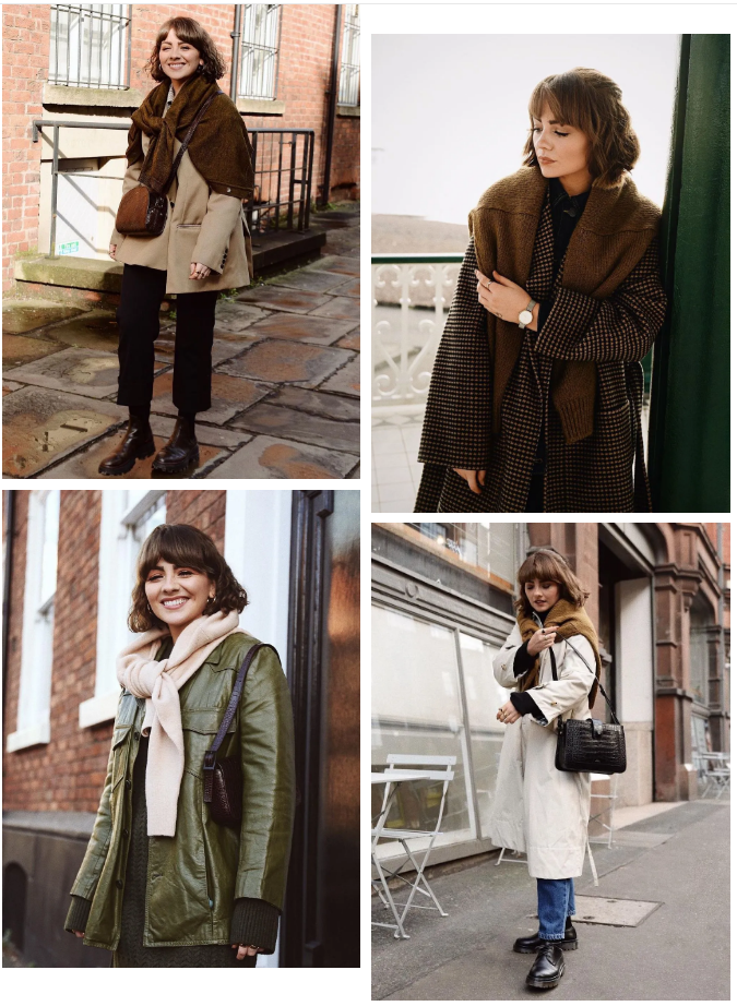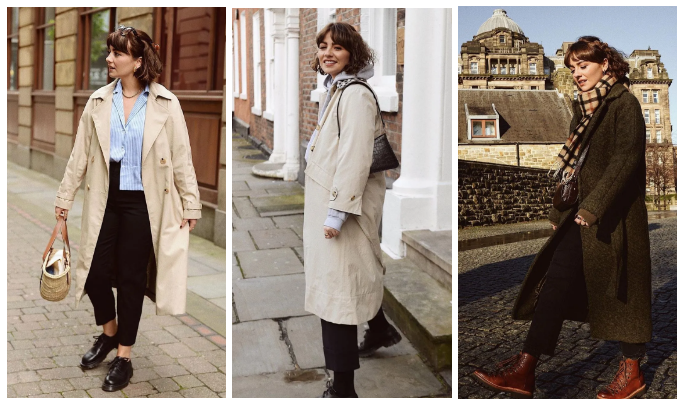 作为英国人,她的衣柜里可不会只有短袖和薄外套。秋天穿风衣+衬衫/卫衣+单鞋,入冬了换成大衣+毛衣+靴子,还不忘加条围巾: