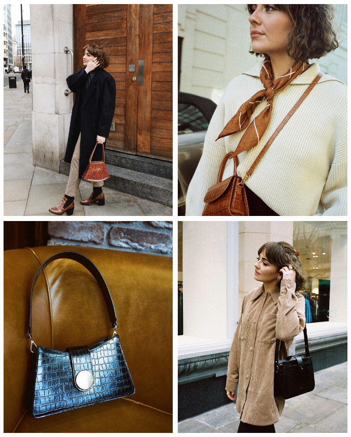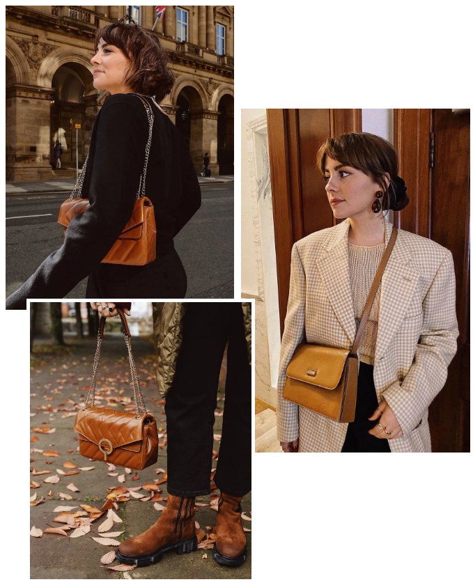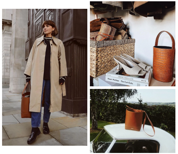 平时搭西装或精致的针织衫、blouse时,会pick更方正的包型。下面这两只分别是Sandro和CELINE,也都是棕色系的。