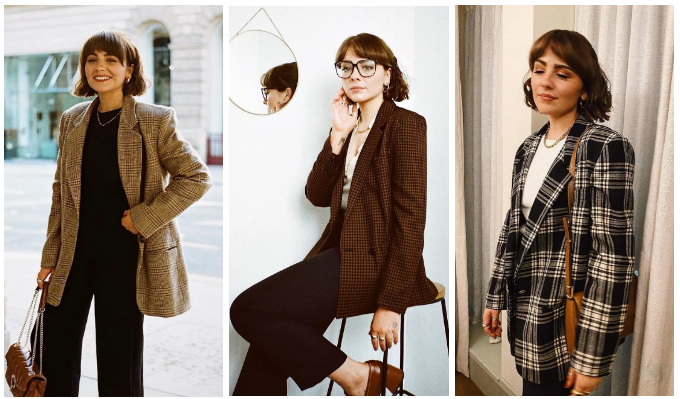 比如这件蓝色vintage马甲,她搭配了同样是vintage的格纹衬衫,和The Frankie Shop的宽肩西装,层次感就出来了: