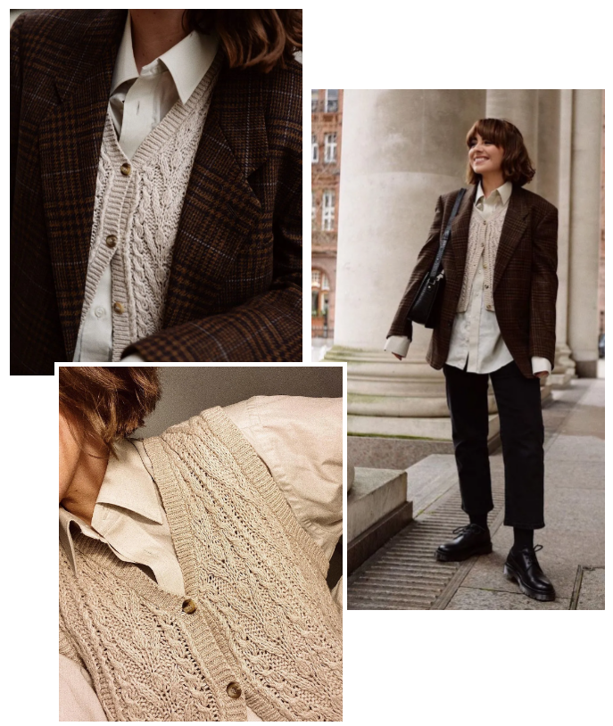 另外她最爱穿的是一件米色的vintage马甲,轻薄的麻花织法。她穿过好几回,常用来叠搭衬衫和毛呢西装。