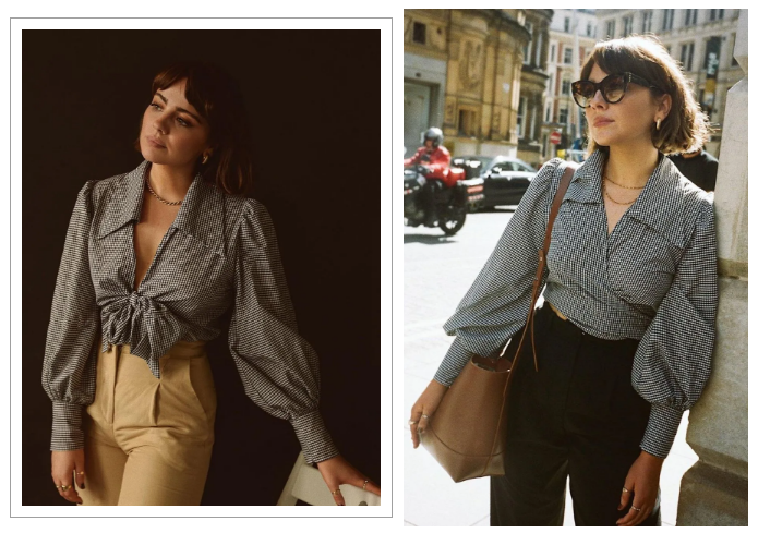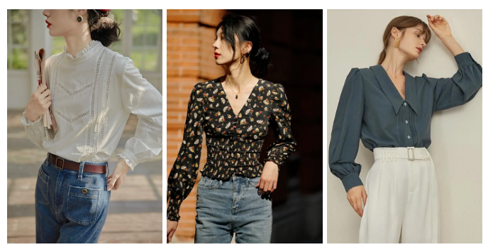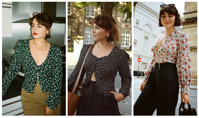 除了图案有自我风格,款式设计也要有特点。比如这种低胸收腰的碎花blouse,她有好几件,是那种复古的田园风格。
