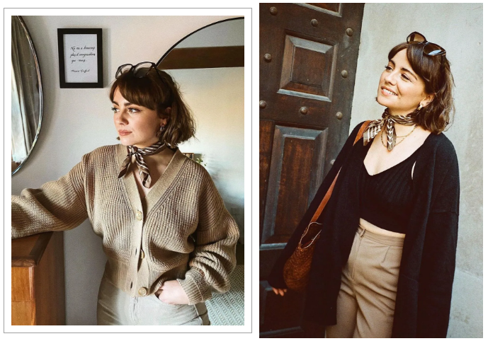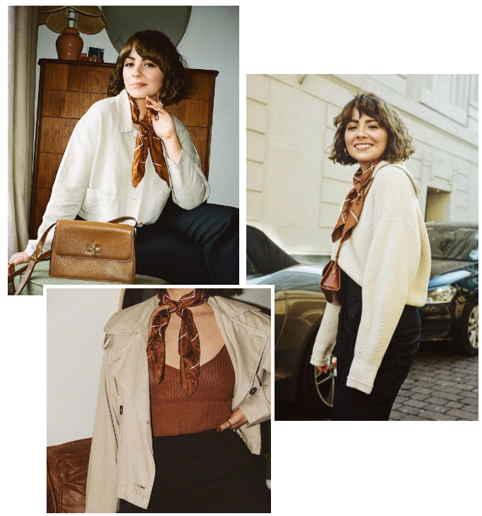 还有一条灰咖色系的条纹丝巾,来自专做丝巾的品牌lescarf。她的搭配思路是同色系和颜色呼应,都没难度,很好掌握。