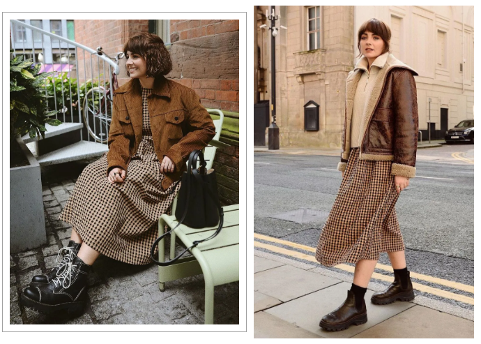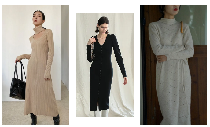 秋天搭过外套的连衣裙,入冬了套一件毛衣,再加一件皮毛一体,完全可以继续穿:
