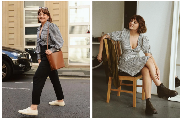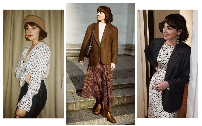 Alice还爱穿一些裹身的设计。她最常穿的是一件波点和一件维西格纹。波点这件是个vintage,春秋天她会单穿,入冬后还会搭配高领衫,实用!