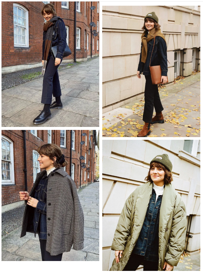 秋天搭单鞋穿的牛仔外套,降温后换成靴子,再加上帽子和围巾。入了深冬,牛仔外套外面还能再加呢大衣,甚至羽绒服。衣服的利用率,就是这么提高的。