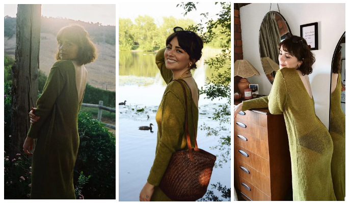 她还有一条挚爱,是个绿色的深V大露背,好几次出去度假都穿了它。这条裙子很透,还做了接缝外露的设计,也是Free People的。