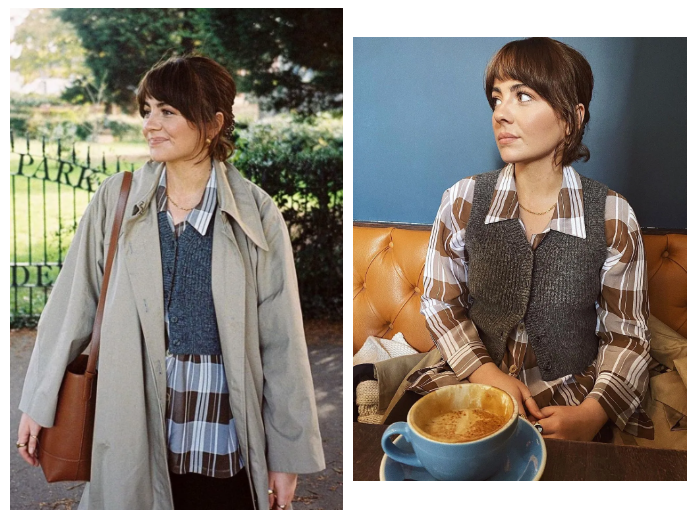 灰色的WEEKDAY马甲呢更短一些,她用来搭配偏长的衬衫(这件格纹衬衫也是个vintage),外面套了件The Frankie Shop的长风衣。