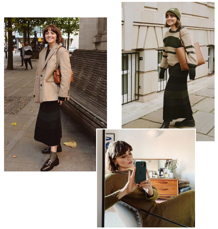 除了针织上衣,Alice对针织裙也是真爱。下面这两条同色系拼接的和橄榄绿的裙子,之前在我们文里都有出现过,分别来自ME+EM和Free