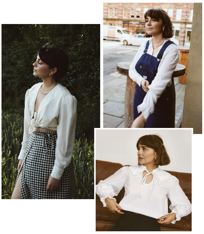 还有刺绣、蕾丝、羊腿袖…这些宫廷感的blouse,她也有几件。我尤其喜欢左边这件白色刺绣款,来自Mad Seventies,她搭了条裹身半裙,太美了!