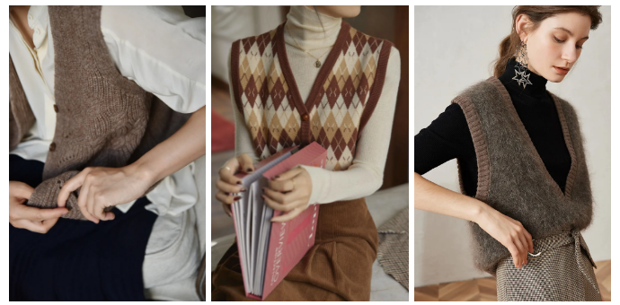 好多人穿习惯了针织开衫,其实换成马甲也还蛮有意思的,套外套时还不用担心袖子处太挤。