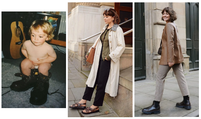 而且款式也有共同点:厚底。前阵子她发了张自己小时候的照片,配文“Always loved a chunky boot”。