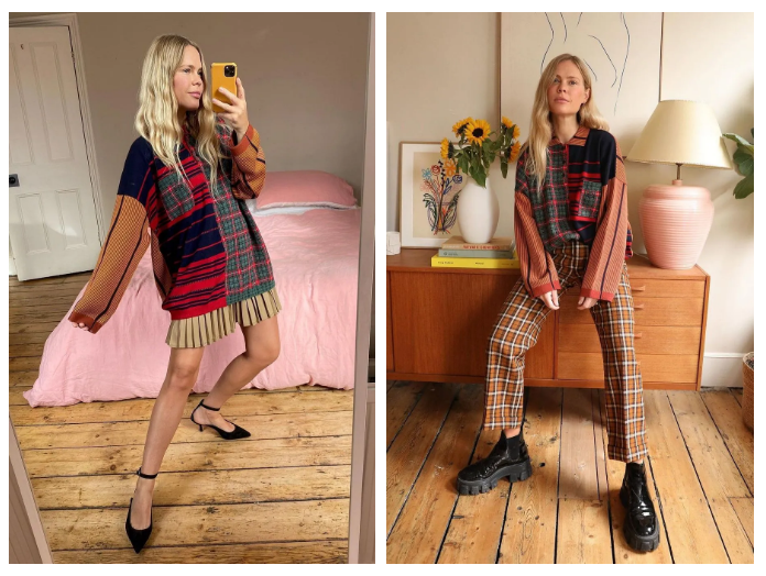 喜欢热闹的妹子可以pick Loewe新出的这款,又是格纹又是条纹的。新西兰博主Jessie Bush入手一件,搭过百褶短裙和格子裤。